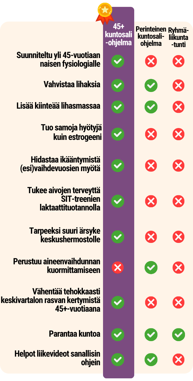 45+ kuntosaliohjelma on suunniteltu naiselle, joka haluaa tukea hyvinvointiaan ja löytää treenin avulla keholleen ne positiiviset vaikutukset, joita hormonitoiminta aiemmin toi luonnostaan.
