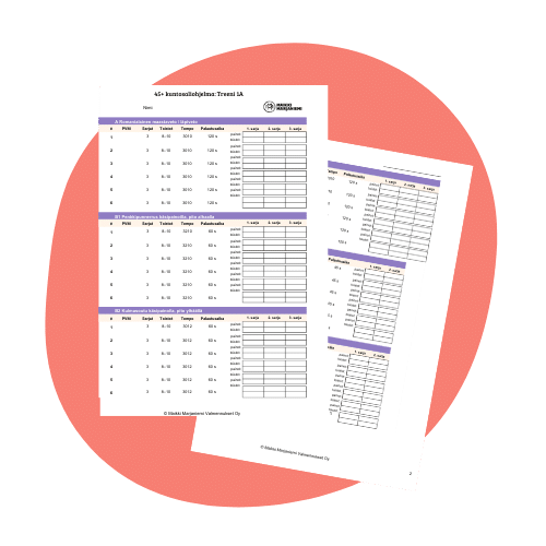 Saat treeneille ladattavat ja tulostettavat treenipäiväkirjatiedostot, joiden avulla voit seurata käyttämiäsi painoja ja tekemiäsi toistoja. Näin sinun on helppo varmistaa, että viikkojen kuluessa käytät pikkuhiljaa suurempia kuormia.