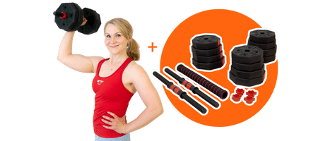 Tämän treeniohjelman mukana saat kaiken mitä tarvitset: säädettävän käsipaino- ja levytankosetin. Painosetti sekä treeniohjelma jäävät sinulle pysyvästi käyttöön.