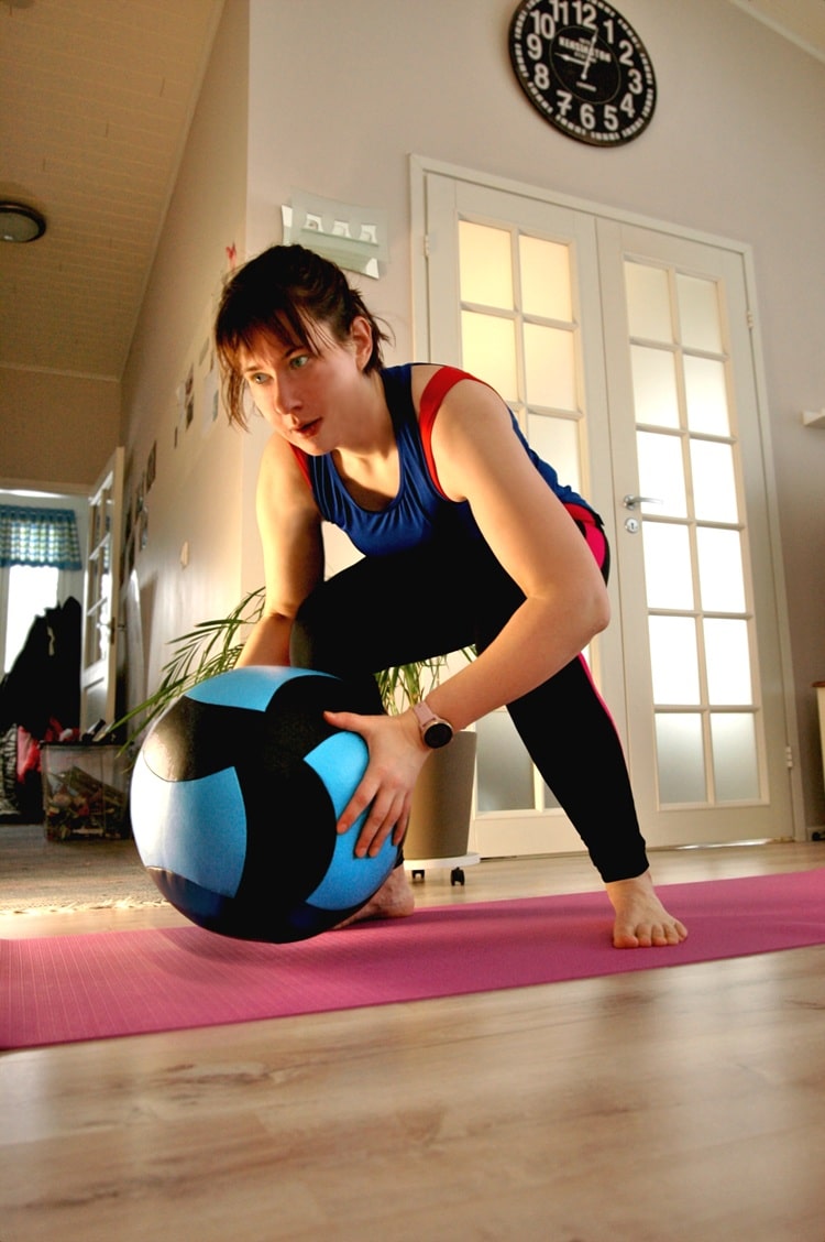Kuntopallotreeneihin ei tarvitse tilaa kovin paljon enempää kuin jumppamaton verran. Ihan mahtavaa, kun ei tarvitse varoa tehdessä mihin huitoo kättä tai jalkaa vaan voi keskittyä tekemiseen. Suosittelen kurssia kyllä ihan kaikille – Sohvi kannustaa videoilla ja opastaa miten liikkeitä voi tehdä kevyemmin tai raskaampana versiona.