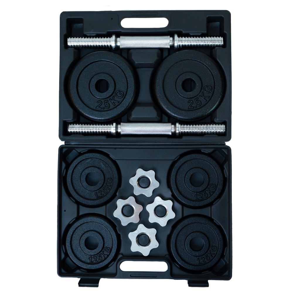 Setissä on 4 x 2,5 kg painoa ja 4 x 1,25 kg painoa sekä pitävät lukot. 2,5 kg levyn halkaisija on 16 cm. Säilytyslaatikon koko on 39 x 30 x 9 cm.