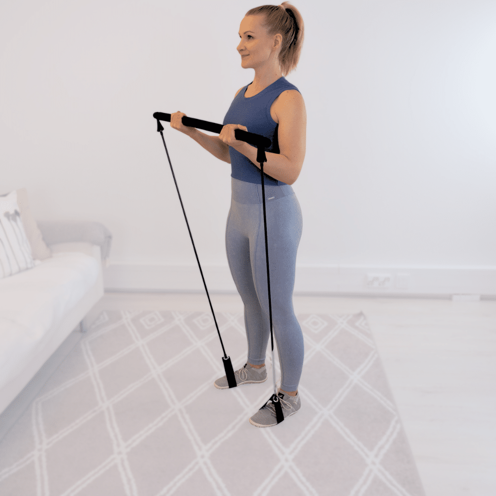 Ota tanko tukevasti otteeseen, pidä hartiat rentoina ja tee vedot, työnnöt ja kierrot tasaisella liikkeellä, hyödyntäen vastuskuminauhojen jännitystä.