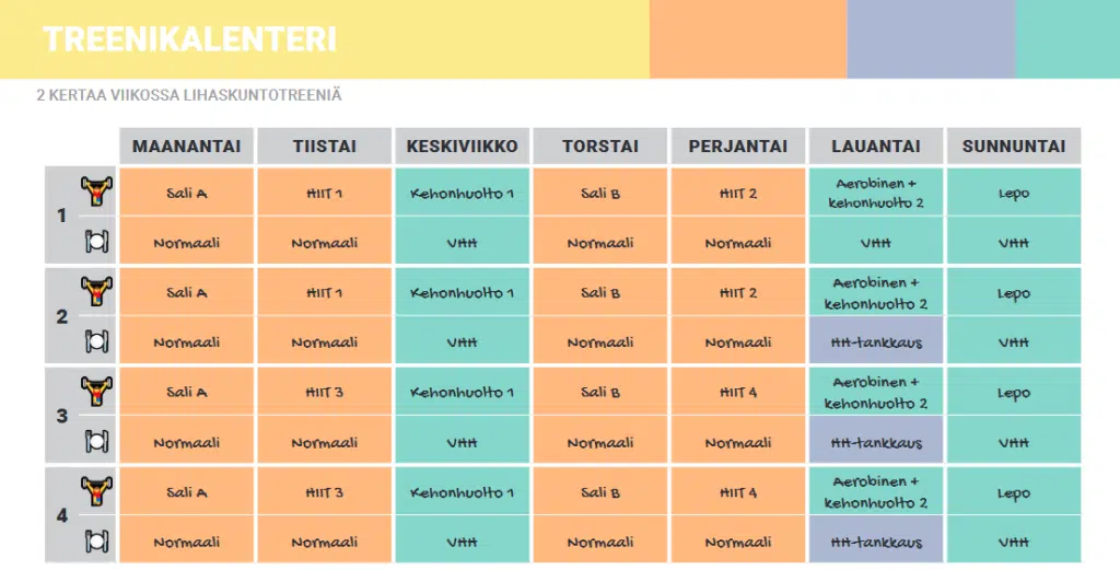 Voit myös laatia esimerkkejä mukaillen oman treenikalenterisi sopimaan esimerkiksi vuorotyöhön.