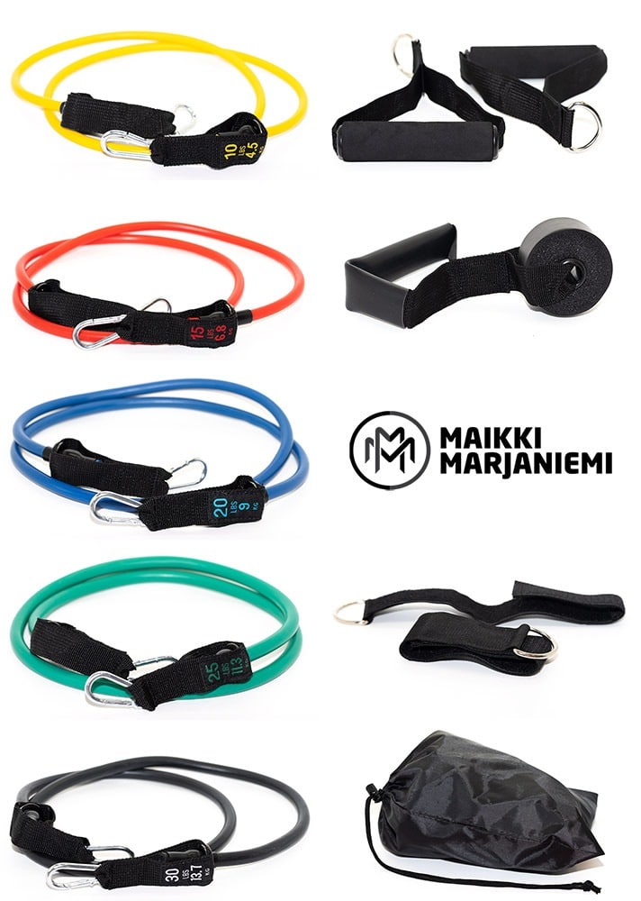 Käsikahvojen avulla saat mukavan otteen kuminauhoista ja oviankkurin avulla voit tehdä samoja liikkeitä kuin kuntosalin taljoilla. Lisäksi saat nilkkaremmit jalkaliikkeitä varten.